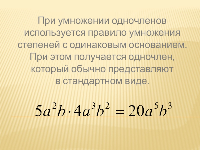 Слайд 5При умножении одночленов используется правило умножения степеней с одинаковым основанием. При