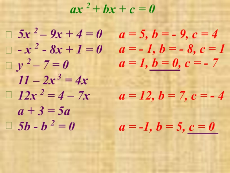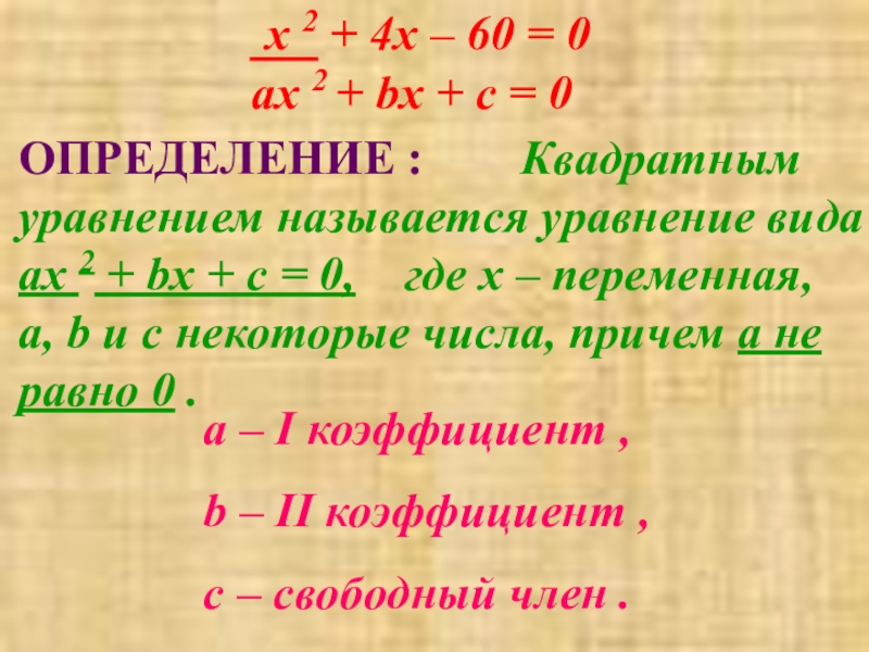 ОПРЕДЕЛЕНИЕ : Квадратным уравнением называется уравнение вида ах 2 + bх + с = 0, где х – переменная, а, b и с некоторые числа, причем а не равно 0 .