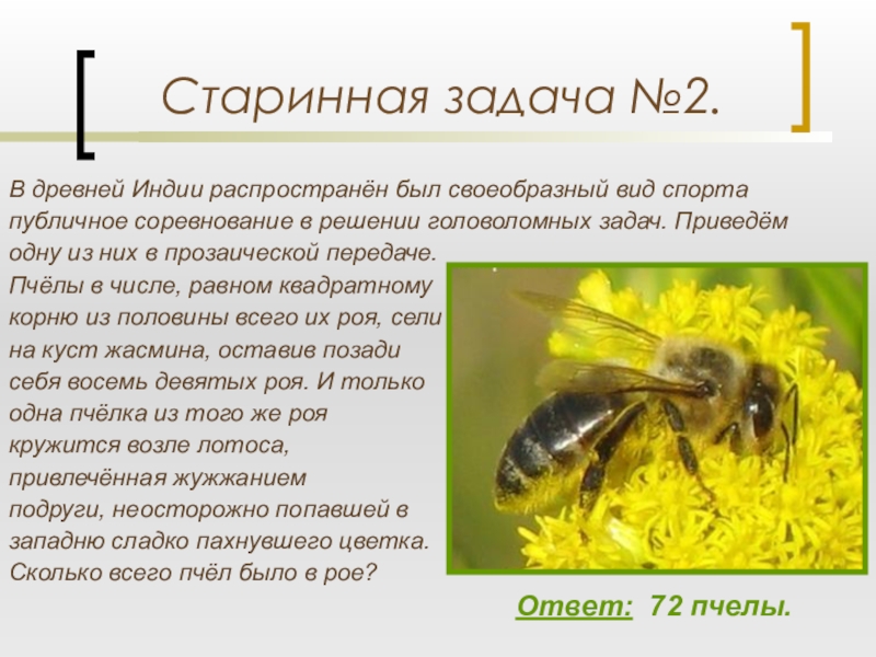 В древней Индии распространён был своеобразный вид спорта публичное соревнование в решении головоломных задач. Приведём одну из них в прозаической передаче.