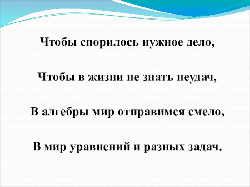 Чтобы спорилось нужное дело, Чтобы в жизни не знать неудач,В алгебры мир отправимся смело, В мир уравнений