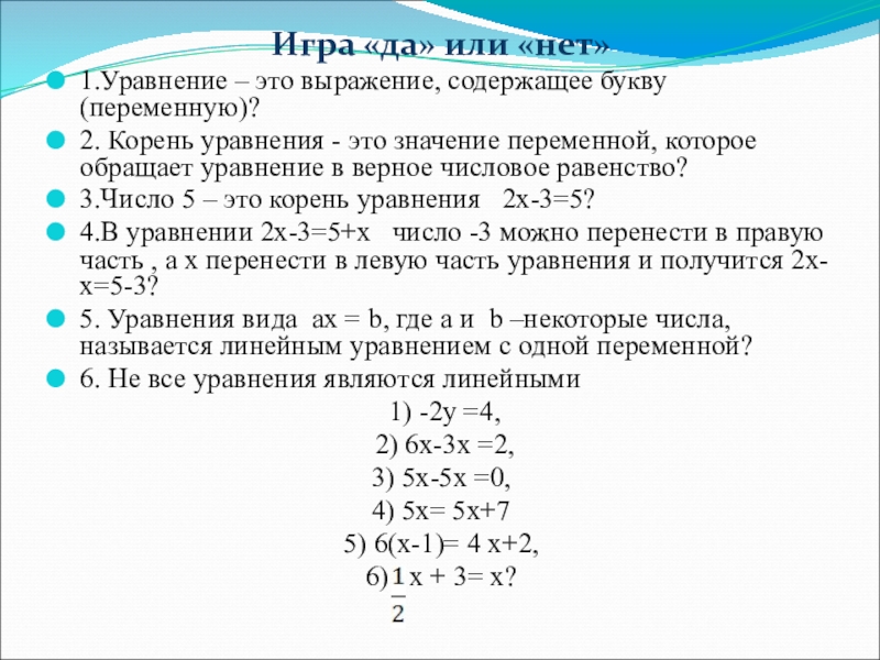 Игра «да» или «нет»1.Уравнение – это выражение, содержащее букву (переменную)? 2. Корень уравнения - это значение переменной,