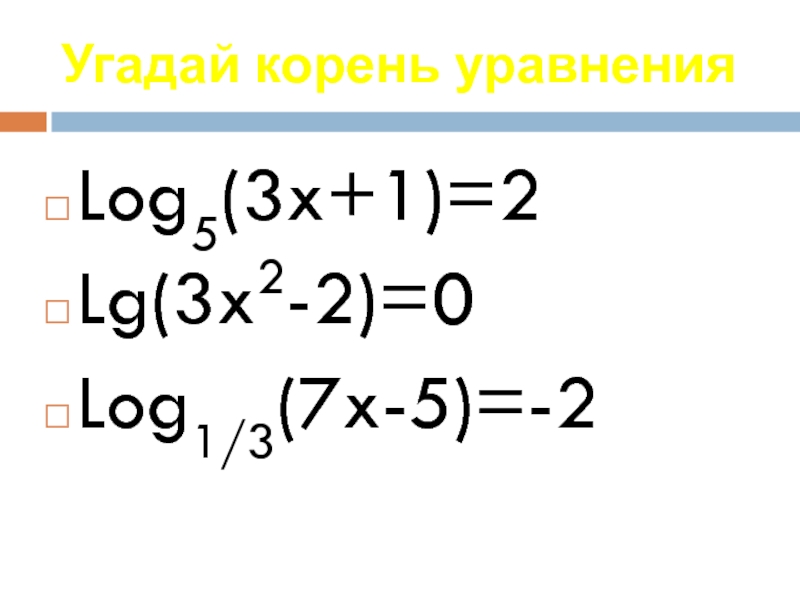 Угадай корень уравненияLog5(3x+1)=2Lg(3x2-2)=0Log1/3(7x-5)=-2
