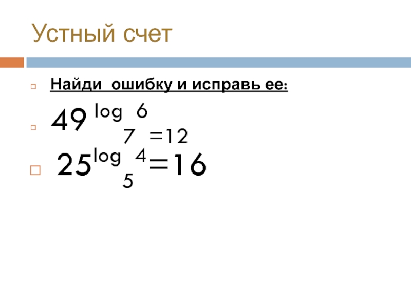 Устный счет Найди ошибку и исправь ее: 49 log76=12 25log54=16