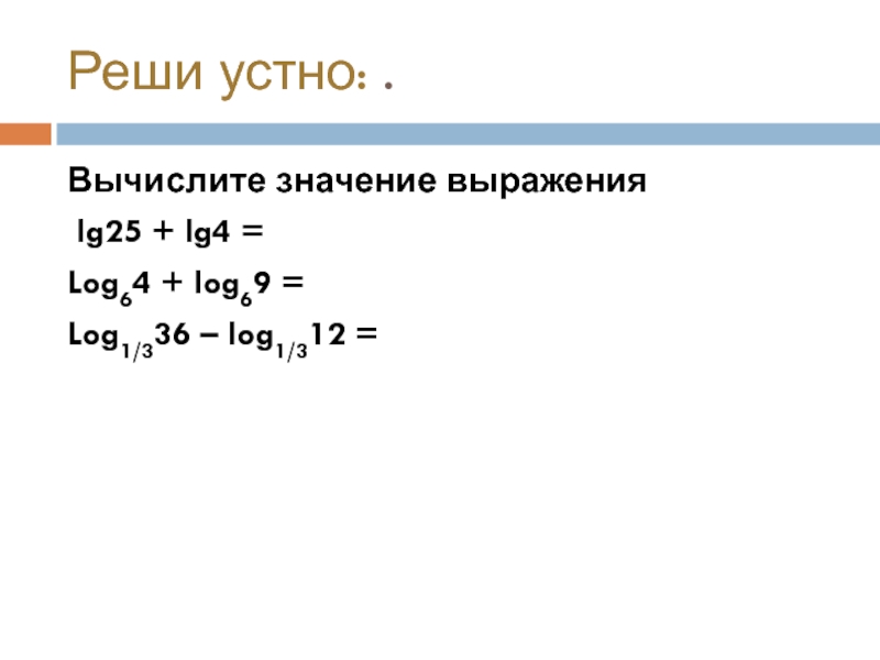 Реши устно: .Вычислите значение выражения  lg25 + lg4 =Log64 + log69 =Log1/336 – log1/312 =