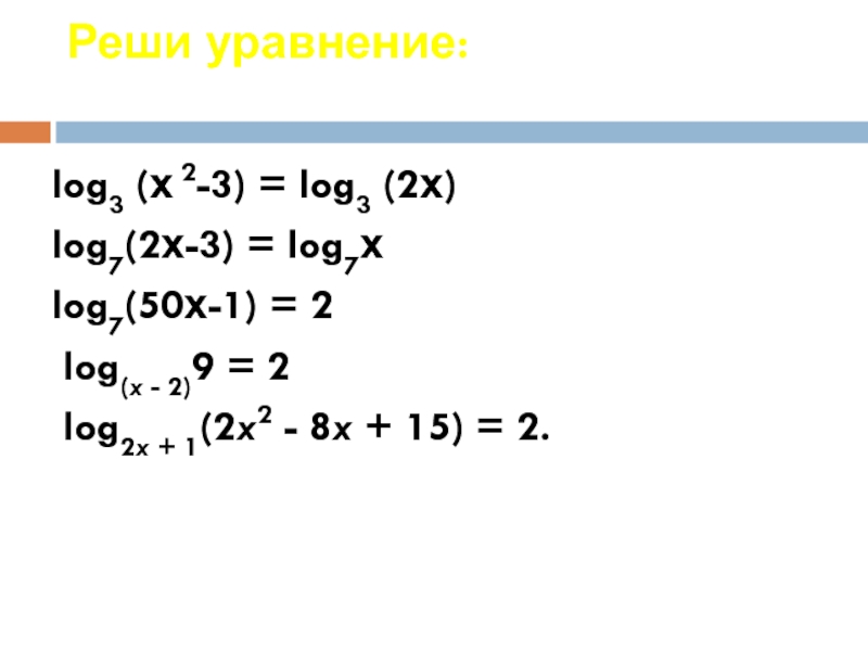 Реши уравнение: log3 (х 2-3) = log3 (2х)log7(2х-3) = log7х log7(50х-1) = 2 log(x - 2)9 = 2 log2x + 1(2x2 - 8x +