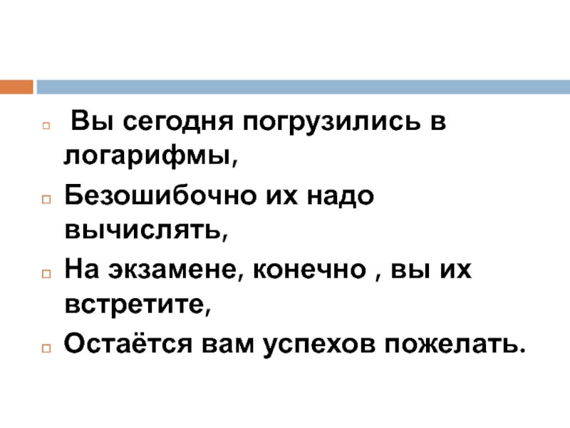 Вы сегодня погрузились в логарифмы,Безошибочно их надо вычислять,На экзамене, конечно , вы их встретите,Остаётся вам успехов