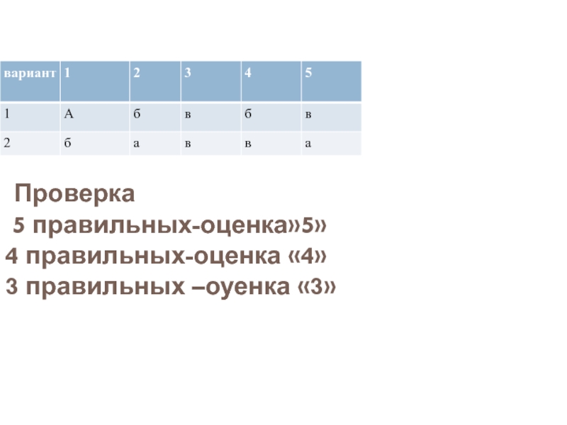 Проверка  5 правильных-оценка»5» 4 правильных-оценка «4» 3 правильных –оуенка «3»