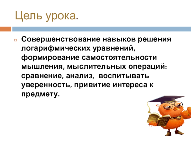 Цель урока.Совершенствование навыков решения логарифмических уравнений, формирование самостоятельности мышления, мыслительных операций: сравнение, анализ, воспитывать уверенность, привитие интереса