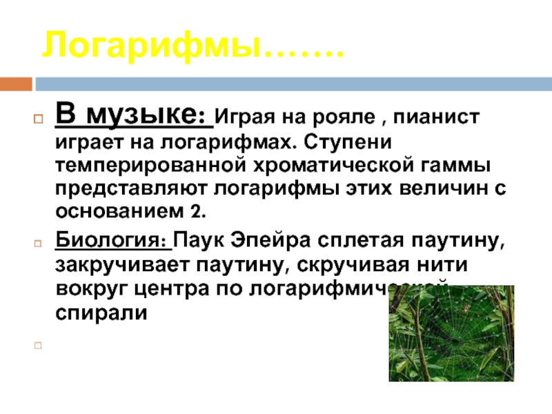 Логарифмы……. В музыке: Играя на рояле , пианист играет на логарифмах. Ступени темперированной хроматической гаммы представляют логарифмы