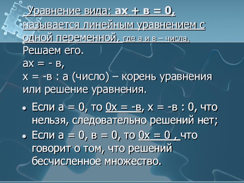 Если а = 0, то 0х = -в, х = -в : 0, что нельзя, следовательно решений нет;