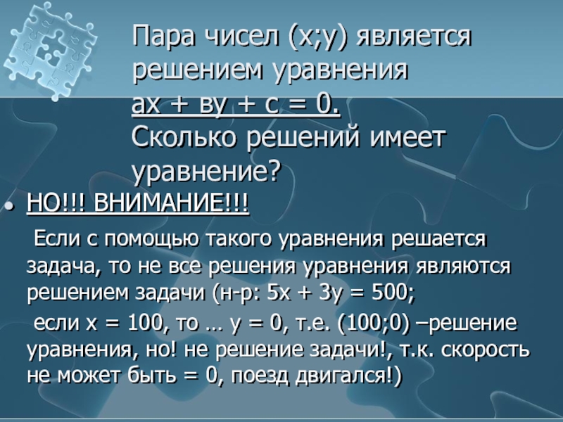 Если с помощью такого уравнения решается задача, то не все решения уравнения являются решением задачи (н-р: 5х + 3у = 500;