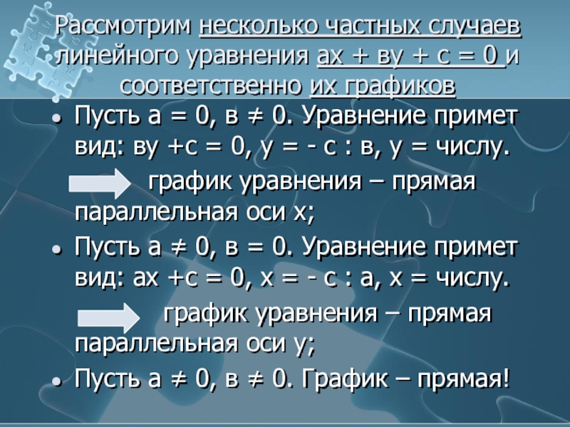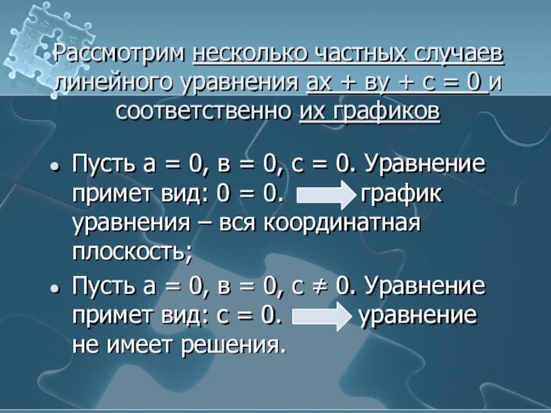 Пусть а = 0, в = 0, с = 0. Уравнение примет вид: 0 = 0. график уравнения – вся координатная плоскость;