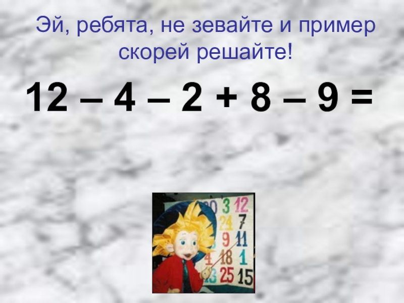 Эй, ребята, не зевайте и пример скорей решайте! 12 – 4 – 2 + 8 – 9
