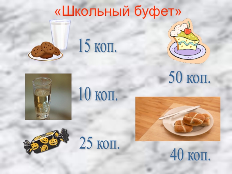 «Школьный буфет»15 коп. 10 коп. 25 коп. 50 коп. 40 коп.