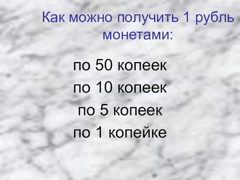 Как можно получить 1 рубль монетами:по 50 копеекпо 10 копеекпо 5 копеекпо 1 копейке