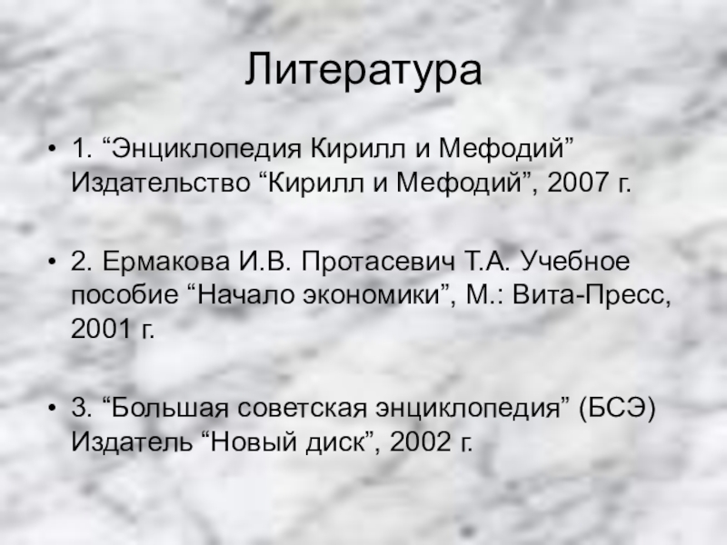 Литература1. “Энциклопедия Кирилл и Мефодий” Издательство “Кирилл и Мефодий”, 2007 г.2. Ермакова И.В. Протасевич Т.А. Учебное пособие