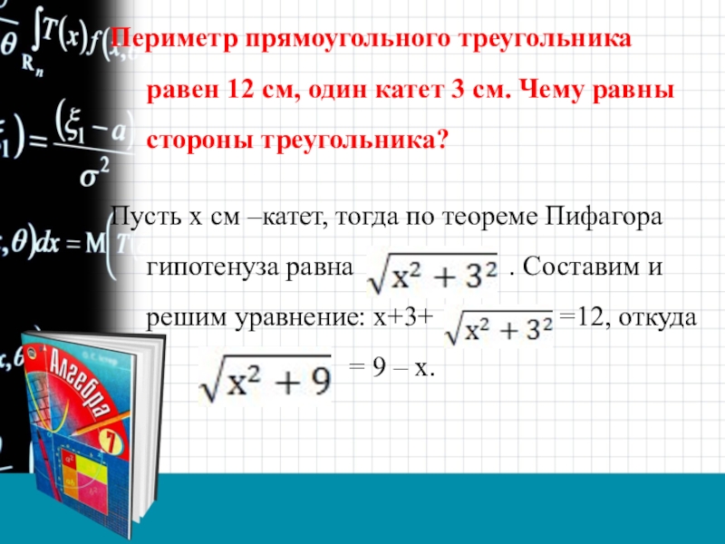 Слайд 4Периметр прямоугольного треугольника равен 12 см, один катет 3 см. Чему