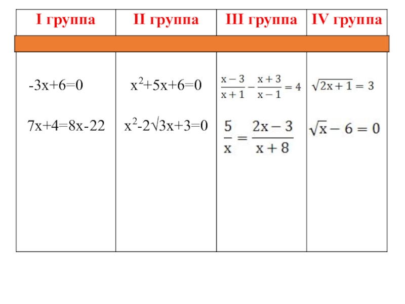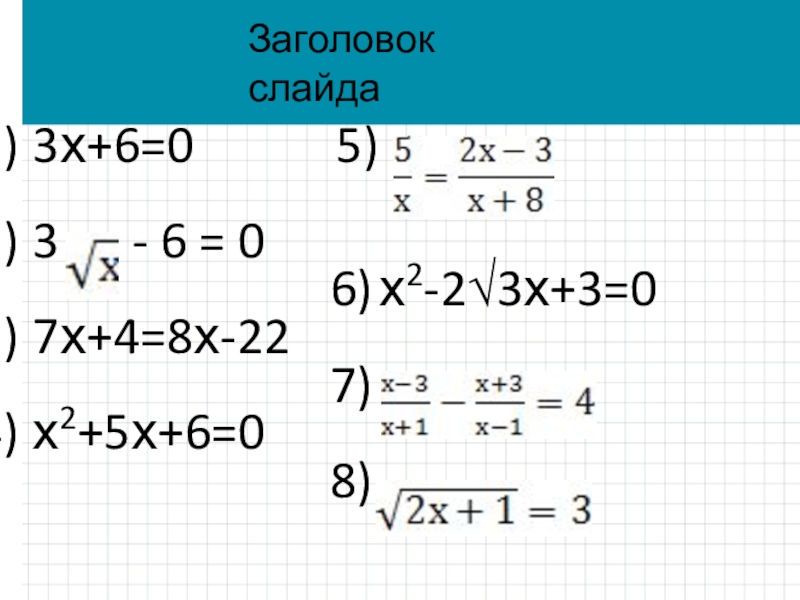 3х+6=03   - 6 = 07х+4=8х-22х2+5х+6=0 Заголовок слайда 5)6) х2-2√3х+3=07)8)