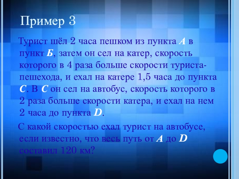 Пример 3	Турист шёл 2 часа пешком из пункта А в пункт Б, затем он сел на катер,