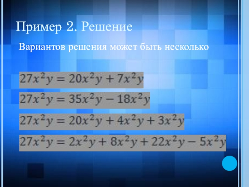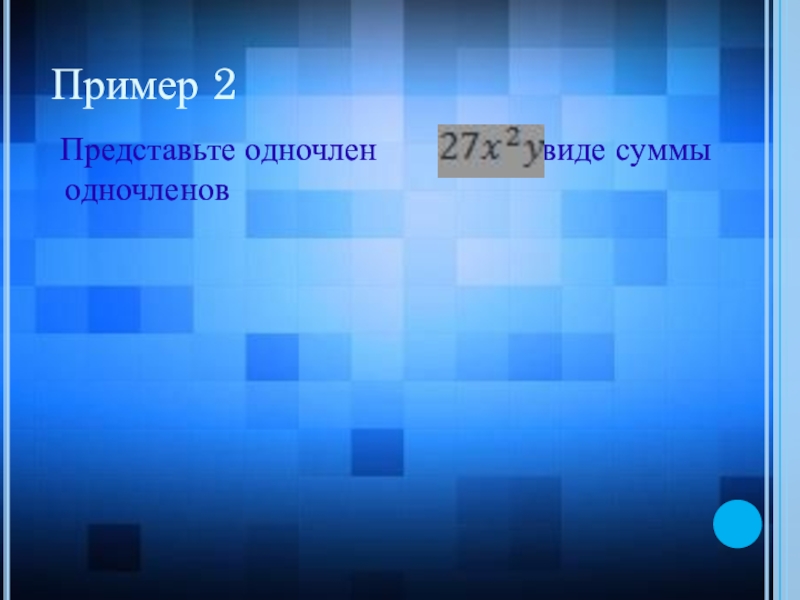 Пример 2	Представьте одночлен        в виде суммы одночленов