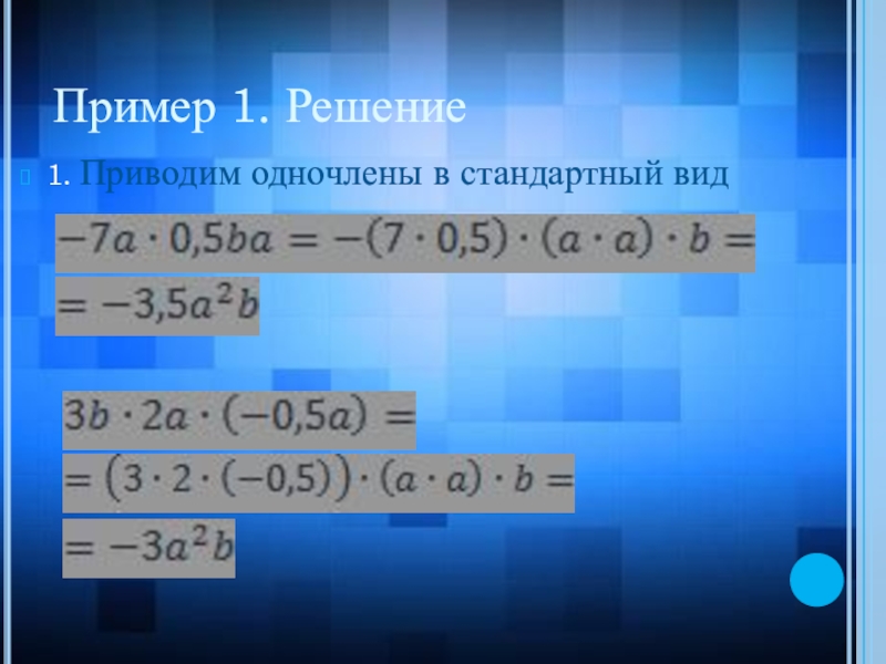 Пример 1. Решение1. Приводим одночлены в стандартный вид