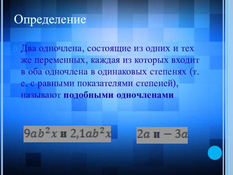ОпределениеДва одночлена, состоящие из одних и тех же переменных, каждая из которых входит в оба одночлена в одинаковых степенях (т.е. с равными показателями степеней), называют подобными одночленами
