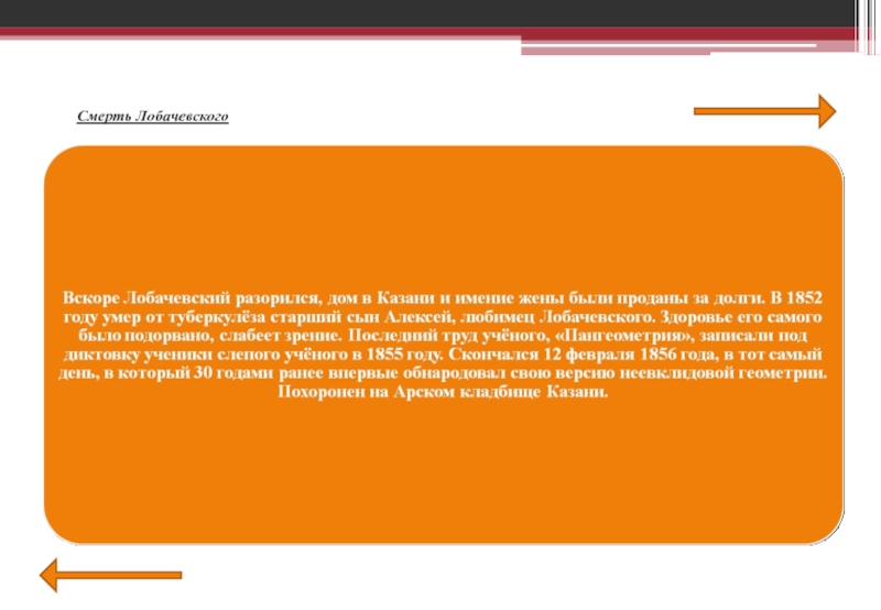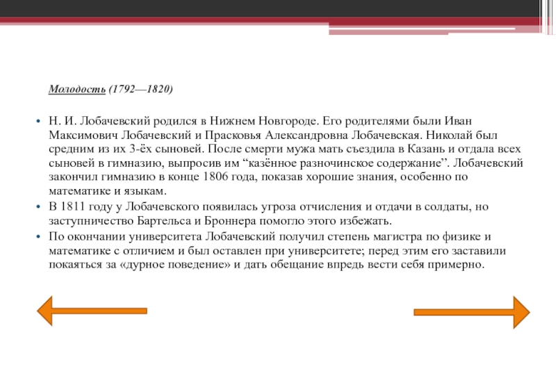 Максимович Лобачевский и Прасковья Александровна Лобачевская. Николай был средним из их 3-ёх сыновей. После смерти мужа мать съездила в Казань и отдала всех сыновей в гимназию, выпросив им “казённое разночинское содержание”. Лобачевский закончил гимназию в конце 1806 года, показав хорошие знания, особенно по математике и языкам.