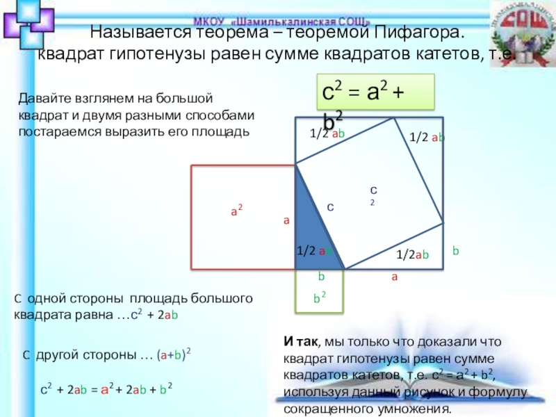 C одной стороны площадь большого квадрата равна …с2 + 2ab