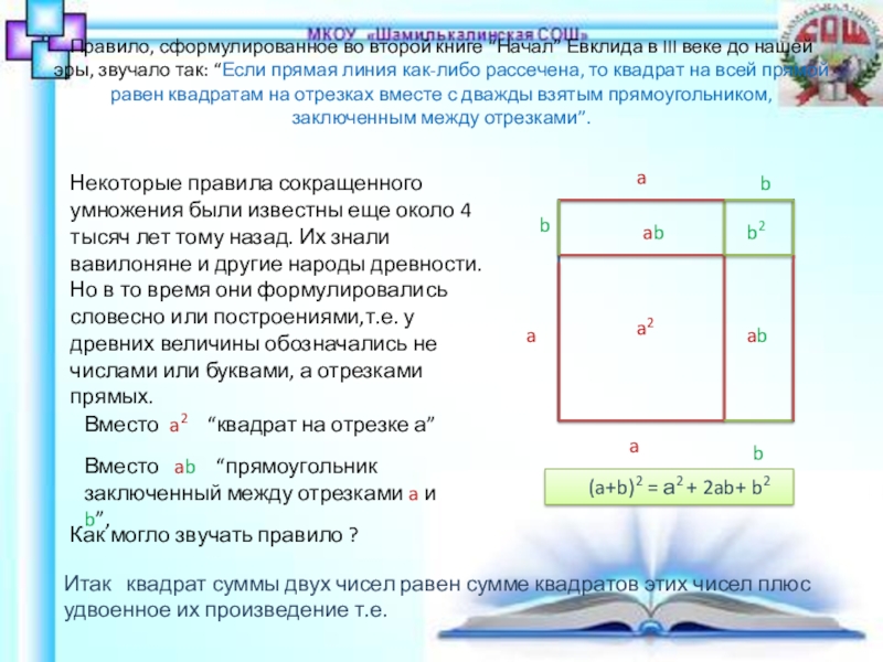 Некоторые правила сокращенного умножения были известны еще около 4 тысяч лет тому назад. Их знали вавилоняне и другие народы древности. Но в то время они формулировались словесно или построениями,т.е. у древних величины обозначались не числами или буквами, а отрезками прямых.