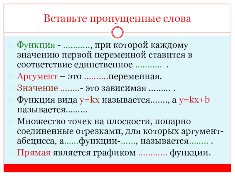 Вставьте пропущенные словаФункция - ……….., при которой каждому значению первой переменной ставится в соответствие единственное ……….. .Аргумент