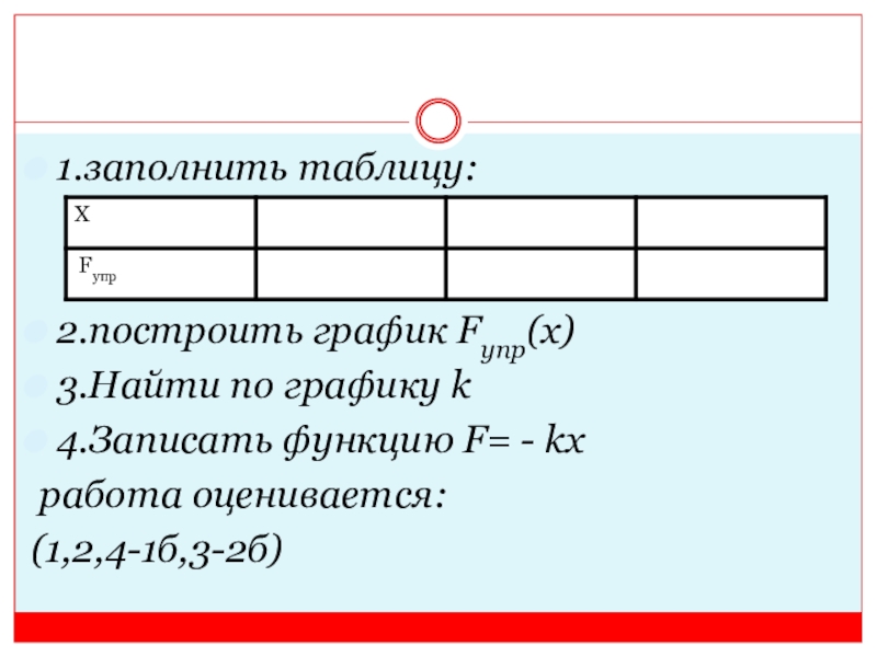 1.заполнить таблицу:2.построить график Fупр(x)3.Найти по графику k4.Записать функцию F= - kx работа оценивается:(1,2,4-1б,3-2б)