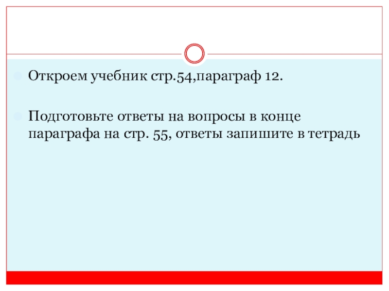 Откроем учебник стр.54,параграф 12.Подготовьте ответы на вопросы в конце параграфа на стр. 55, ответы запишите в тетрадь