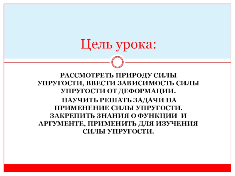 РАССМОТРЕТЬ ПРИРОДУ СИЛЫ УПРУГОСТИ, ВВЕСТИ ЗАВИСИМОСТЬ СИЛЫ УПРУГОСТИ ОТ ДЕФОРМАЦИИ. НАУЧИТЬ РЕШАТЬ ЗАДАЧИ НА ПРИМЕНЕНИЕ СИЛЫ УПРУГОСТИ. ЗАКРЕПИТЬ ЗНАНИЯ О ФУНКЦИИ И АРГУМЕНТЕ, ПРИМЕНИТЬ ДЛЯ ИЗУЧЕНИЯ СИЛЫ УПРУГОСТИ.Цель урока: