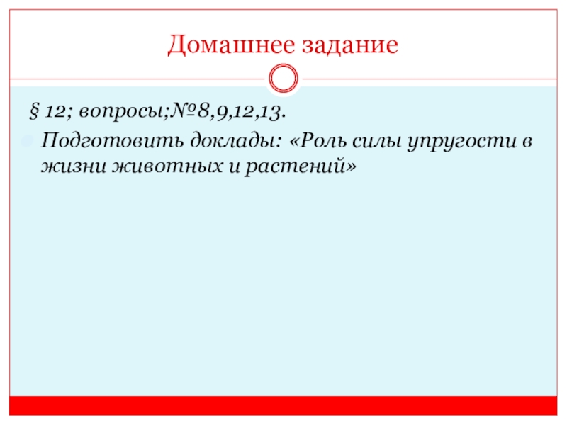 Домашнее задание § 12; вопросы;№8,9,12,13. Подготовить доклады: «Роль силы упругости в жизни животных и растений»
