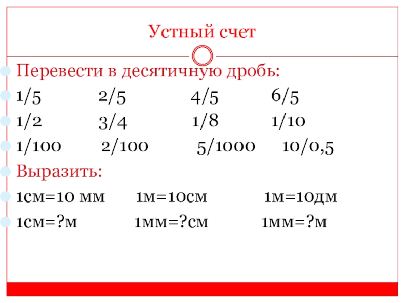 Устный счетПеревести в десятичную дробь:1/5       2/5
