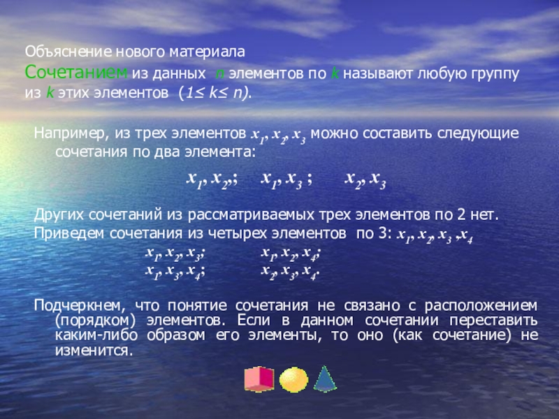 Например, из трех элементов x1, x2, x3 можно составить следующие сочетания по два элемента:
