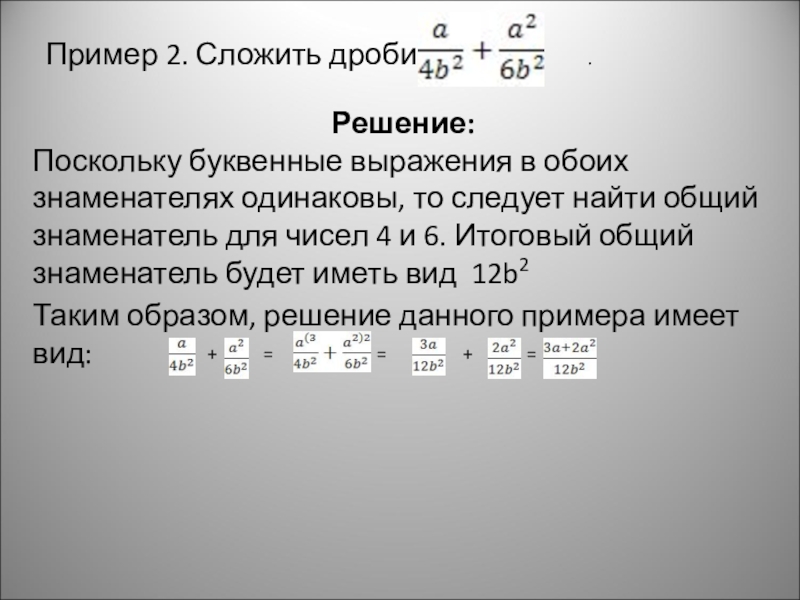 Поскольку буквенные выражения в обоих знаменателях одинаковы, то следует найти общий знаменатель для чисел 4 и 6. Итоговый общий знаменатель будет иметь вид 12b2