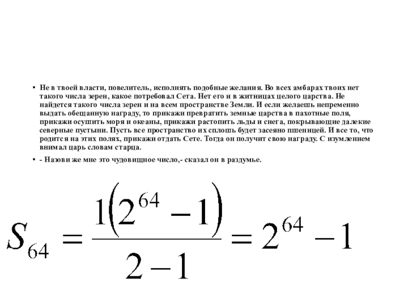 — Повелитель, — был ответ, — приказание твое исполняется. Придворные математики исчисляют число следуемых зерен.
