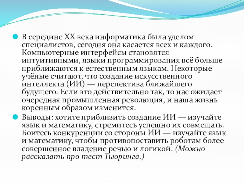 Выводы: хотите приблизить создание ИИ — изучайте язык и математику, стремитесь успешно их совмещать. Боитесь конкуренции со стороны ИИ — изучайте язык и математику, чтобы противопоставить роботам более совершенное владение речью и логикой. (Можно рассказать про тест Тьюринга.)
