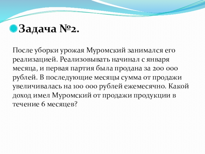 января месяца, и первая партия была продана за 200 000 рублей. В последующие месяцы сумма от продажи увеличивалась на 100 000 рублей ежемесячно. Какой доход имел Муромский от продажи продукции в течение 6 месяцев?