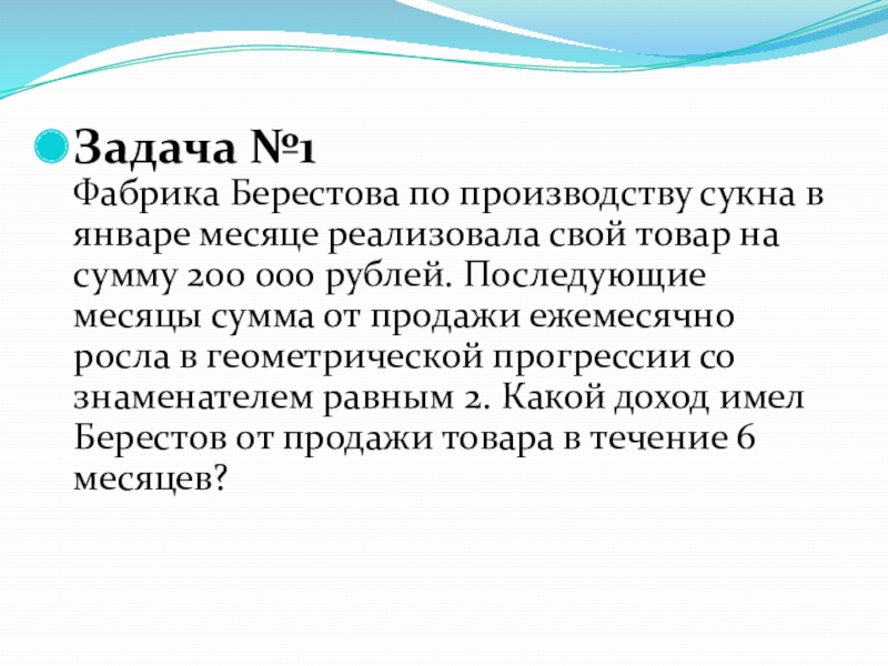 товар на сумму 200 000 рублей. Последующие месяцы сумма от продажи ежемесячно росла в геометрической прогрессии со знаменателем равным 2. Какой доход имел Берестов от продажи товара в течение 6 месяцев?