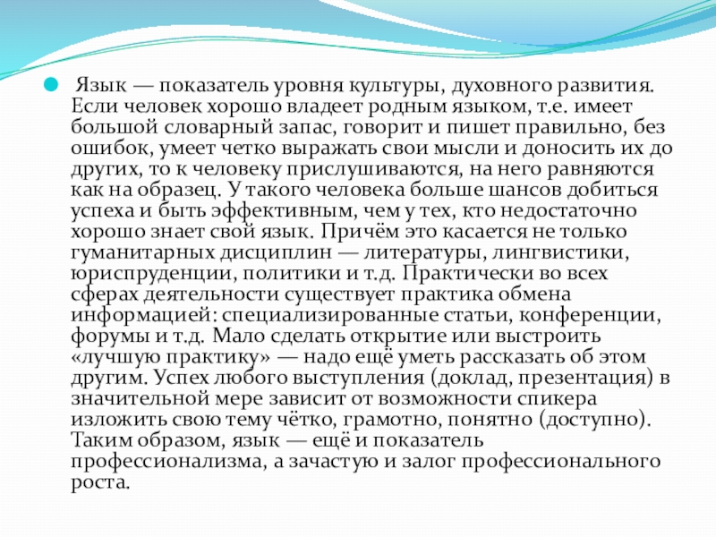 владеет родным языком, т.е. имеет большой словарный запас, говорит и пишет правильно, без ошибок, умеет четко выражать свои мысли и доносить их до других, то к человеку прислушиваются, на него равняются как на образец. У такого человека больше шансов добиться успеха и быть эффективным, чем у тех, кто недостаточно хорошо знает свой язык. Причём это касается не только гуманитарных дисциплин — литературы, лингвистики, юриспруденции, политики и т.д. Практически во всех сферах деятельности существует практика обмена информацией: специализированные статьи, конференции, форумы и т.д. Мало сделать открытие или выстроить «лучшую практику» — надо ещё уметь рассказать об этом другим. Успех любого выступления (доклад, презентация) в значительной мере зависит от возможности спикера изложить свою тему чётко, грамотно, понятно (доступно). Таким образом, язык — ещё и показатель профессионализма, а зачастую и залог профессионального роста.