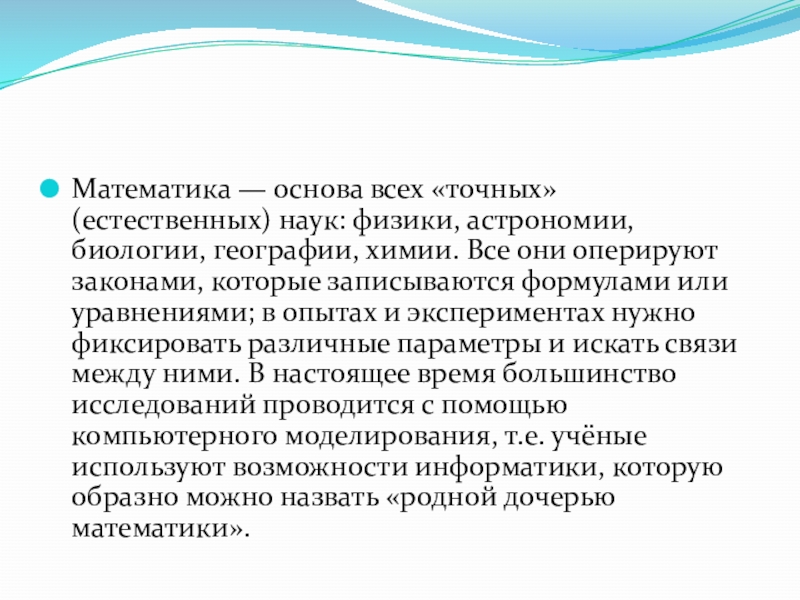 Слайд 20Математика — основа всех «точных» (естественных) наук: физики, астрономии, биологии, географии,