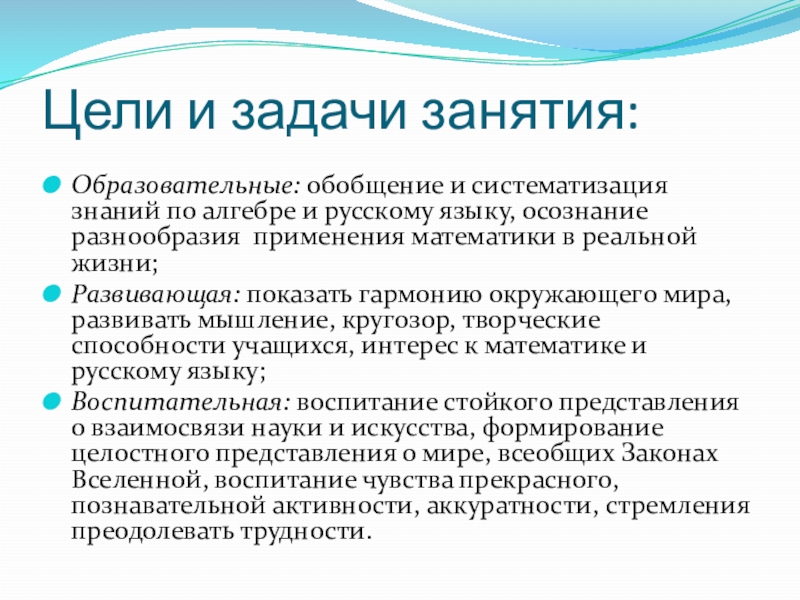 Развивающая: показать гармонию окружающего мира, развивать мышление, кругозор, творческие способности учащихся, интерес к математике и русскому языку;