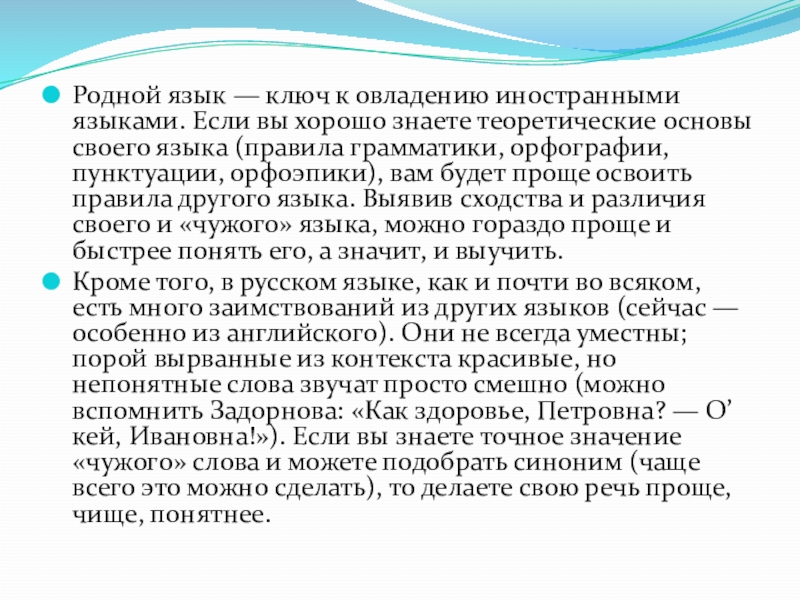Слайд 14Родной язык — ключ к овладению иностранными языками. Если вы хорошо