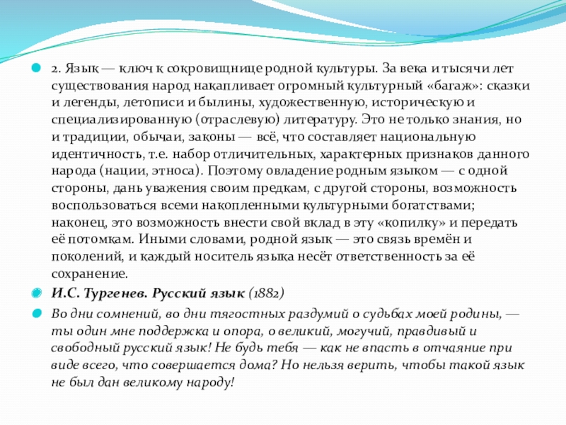 тысячи лет существования народ накапливает огромный культурный «багаж»: сказки и легенды, летописи и былины, художественную, историческую и специализированную (отраслевую) литературу. Это не только знания, но и традиции, обычаи, законы — всё, что составляет национальную идентичность, т.е. набор отличительных, характерных признаков данного народа (нации, этноса). Поэтому овладение родным языком — с одной стороны, дань уважения своим предкам, с другой стороны, возможность воспользоваться всеми накопленными культурными богатствами; наконец, это возможность внести свой вклад в эту «копилку» и передать её потомкам. Иными словами, родной язык — это связь времён и поколений, и каждый носитель языка несёт ответственность за её сохранение.