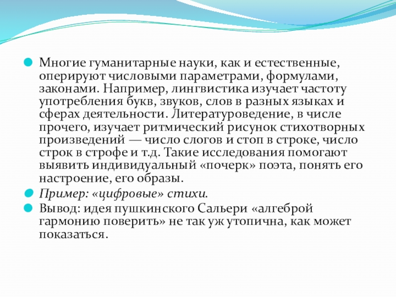 Слайд 25Многие гуманитарные науки, как и естественные, оперируют числовыми параметрами, формулами, законами.