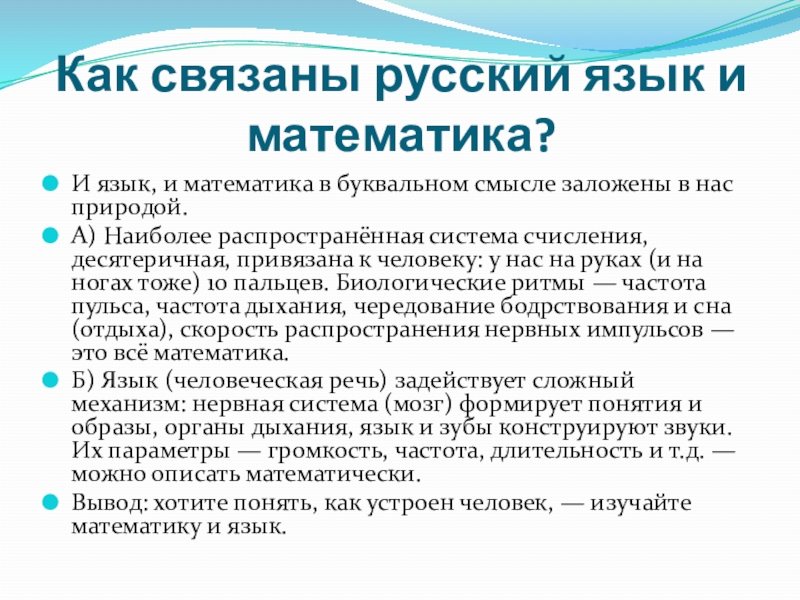 А) Наиболее распространённая система счисления, десятеричная, привязана к человеку: у нас на руках (и на ногах тоже) 10 пальцев. Биологические ритмы — частота пульса, частота дыхания, чередование бодрствования и сна (отдыха), скорость распространения нервных импульсов — это всё математика.