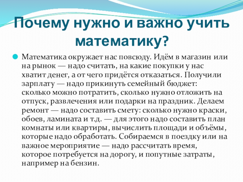 магазин или на рынок — надо считать, на какие покупки у нас хватит денег, а от чего придётся отказаться. Получили зарплату — надо прикинуть семейный бюджет: сколько можно потратить, сколько нужно отложить на отпуск, развлечения или подарки на праздник. Делаем ремонт — надо составить смету: сколько нужно краски, обоев, ламината и т.д. — для этого надо составить план комнаты или квартиры, вычислить площади и объёмы, которые надо обработать. Собираемся в поездку или на важное мероприятие — надо рассчитать время, которое потребуется на дорогу, и попутные затраты, например на бензин.