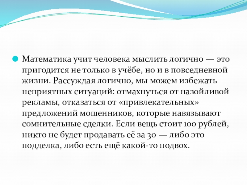 Слайд 19Математика учит человека мыслить логично — это пригодится не только в